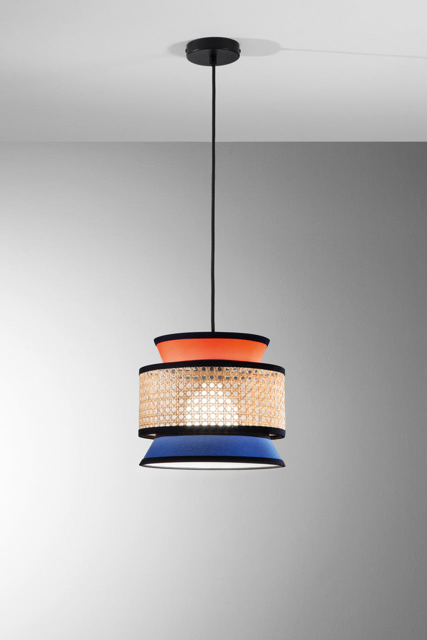 Lampada a sospensione Gazebo realizzata con cura artigianale, che combina rattan naturale con finiture in arancione e blu. Dotata di portalampada E27 singolo, presenta un diametro di 26 cm e lunghezza regolabile fino a 200 cm, adattandosi a diversi ambienti. La costruzione in materiali naturali garantisce solidità e un'estetica ricercata, ideale per chi ricerca soluzioni di illuminazione dal carattere distintivo e sostenibile.